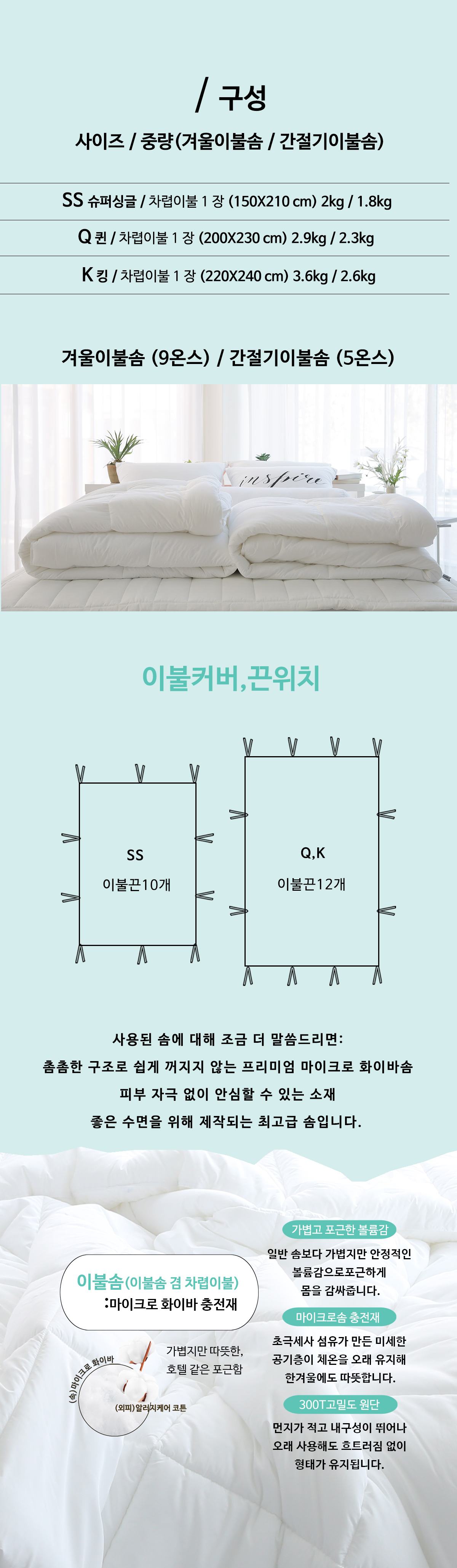 호텔 이불솜 (SS/Q/K), 세탁가능
