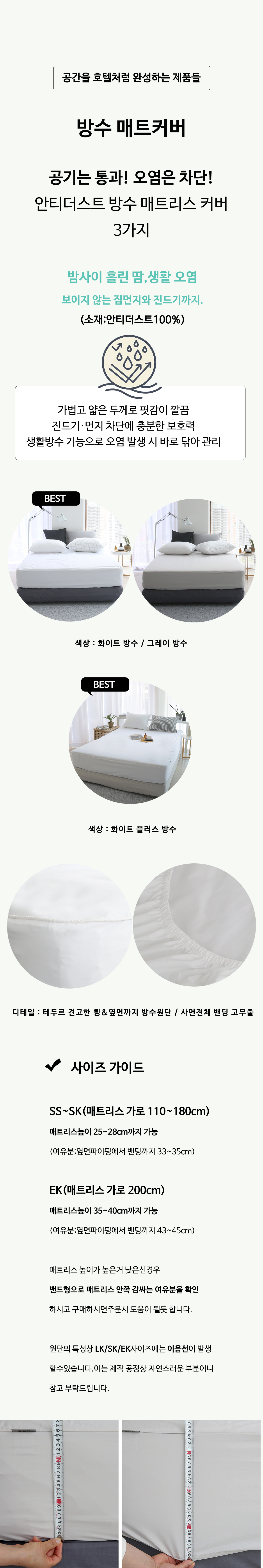 화이트 방수매트커버(EK:200) 구매했는데 저희집 매트리스가 크고 높아서 매트리스커버 찾기가 힘들었는데, (베스트슬립꺼 라지킹, 높이는 43cm 정도) 요거는 잘 맞아요!!!! 사이즈도 만족하고 재질도 만족하고 완전 강추에용 !!!!!