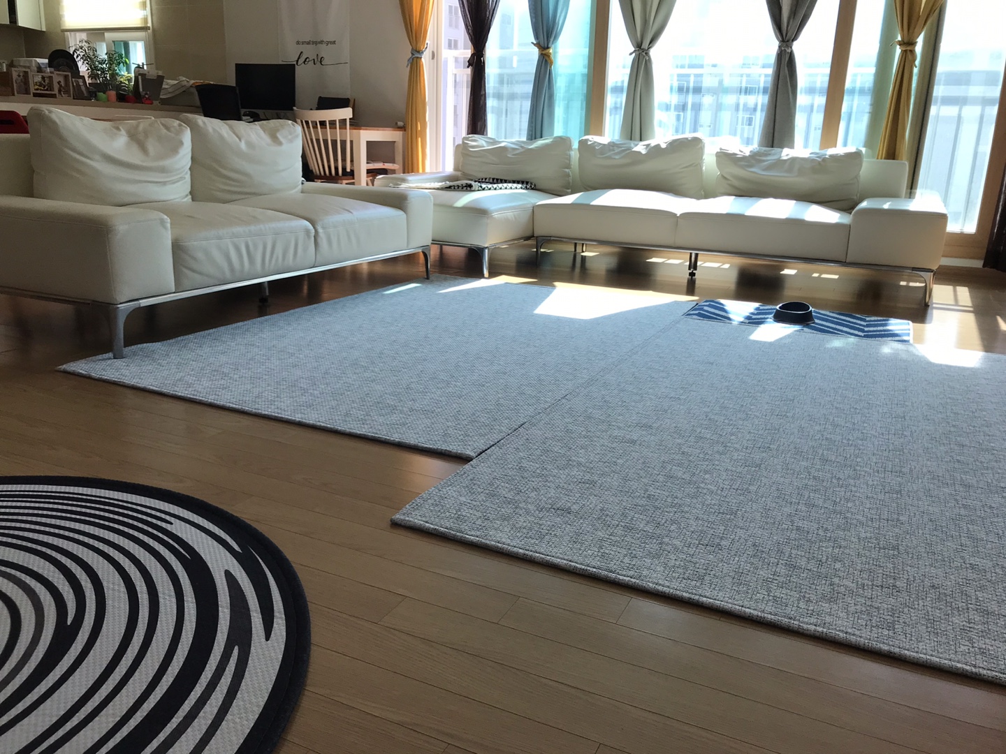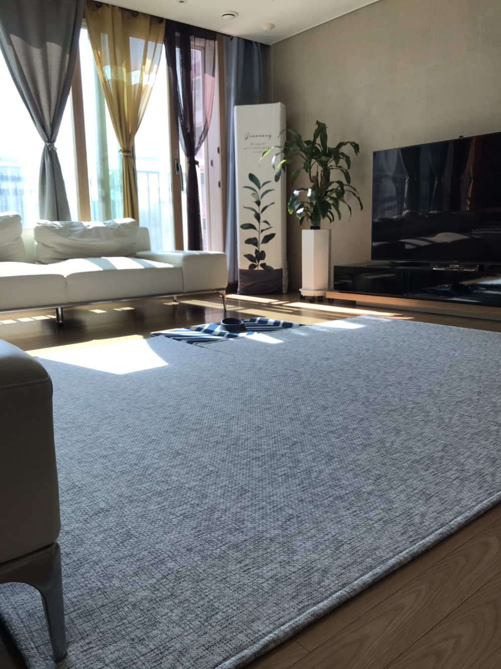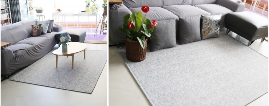 처음 도착하자마자 거실에 그레이그라운드러그 바로 깔아놓고서는 얼마나 기쁘던지요~ 색이 밝으니. 거실 느낌이 더 사는 거 같아요.^^ 더불어 더 아늑해졌네요. 테이블을 올려 두어도 쉽게 밀리지 않고 공간을더 실용적으로 사용할 수 있게 되서 넘 좋으네요~ 모닝커피 하고 보면, 아이들이 거실러그 위에 줄줄이 누워 따스함을 느끼기도 하고~ 포근하면서도 촉감이 좋은 소재라... 다들 만족하며 사용중이에요.