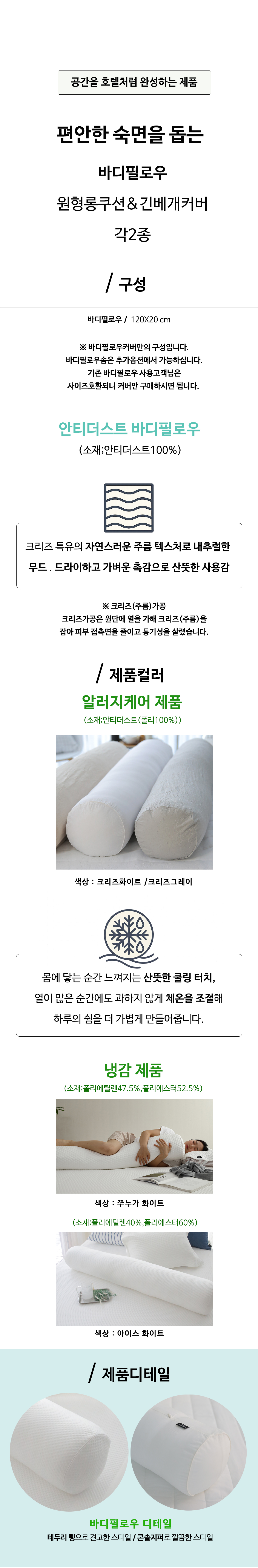 더운 여름 안고 자도 답답함 없을~피부에 닿았을때도 시원한감이여서 만족합니다.구김이 있어보이는 소재라 보기에도 시원해보여 좋아요~늘 면으로 된것만 사용해서 여름엔 더웠었는데~그레이색..고민좀 했었는데..전혀 답답해보이지않고 시원한색의 그레이네요~ 화이트가 면소재와 다르게 더 하얗고 밝게 보이는 소재인거 같아 완전 깔끔해 보여서 침대가 환해지는것 같네요~이런소재는 시중에서는 찾아보기가 어려운데..바디필로우~ 더운여름 시원한 커버로 잘 안고 잘수 있을거 같아요. 여름이라 솜과 커버 교체했는데 와~솜 길이가 기존 시중 판매하는것보다 훨씬 길어서 너무 좋으네요.사실 길이는 다 같은 거란 생각에 사이즈 체크 안하고 구매핬는데 길어서 너무 좋아요~이런 조금 다름의 차이가 만족감이 드네요~
