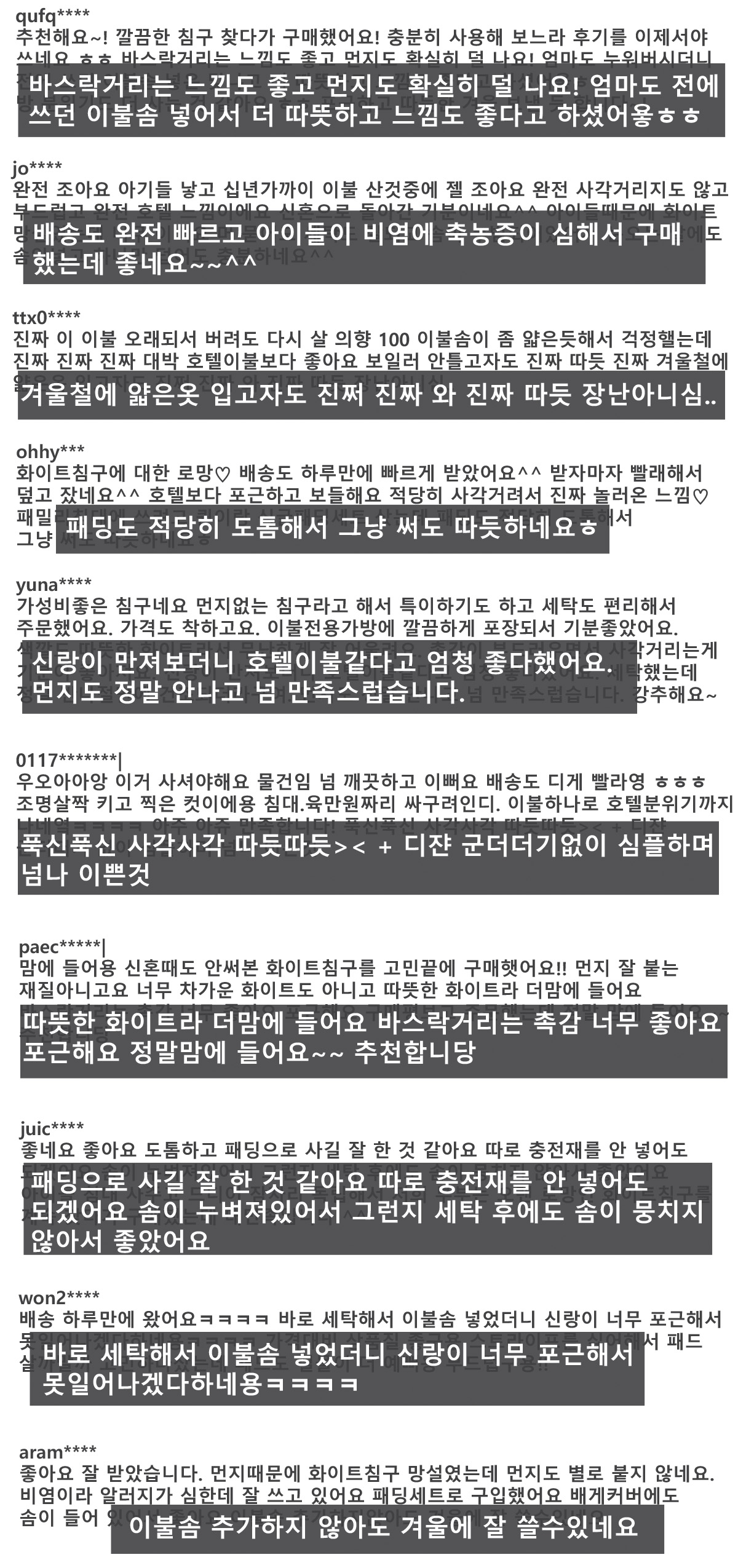 왜 안사요? 색도 따뜻한 화이트라 예쁘고 바스락거리는 소재도 좋고 무엇보다 고양이 털이 많이 안붙어요ㅠㅠ! 간절기라 이불 솜 없이 패딩이불 하나만 쓰고 있어요! 베개도 폭신폭신하고 좋네요. 빠른 배송 감사드려요!