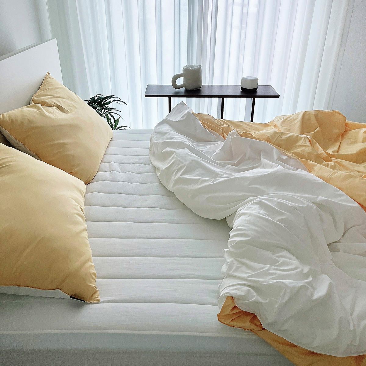 예전엔 새하얀 침구가 부담스러웠는데 언제가부터 뽀얀 화이트침구, 일명 호텔식 침구가 이뻐 보이더라구요~🤍 안티더스트 기능성원단 소재로 부드러우면서 호텔침구 느낌의 바스락한 터치감과 먼지없는 침구~ 넘 좋아요. 테두리는 블랙 파이핑이 되어있어서 좀더 선명한 깔끔함과 세련됨이 느껴졌어요! 화이트 침구 도전해보세요🤍🤍 생각했던것 보다 훨씬 더 화사하고 분위기가 좋답니다! 우드 침대 프레임과도 잘 어울렸어요.