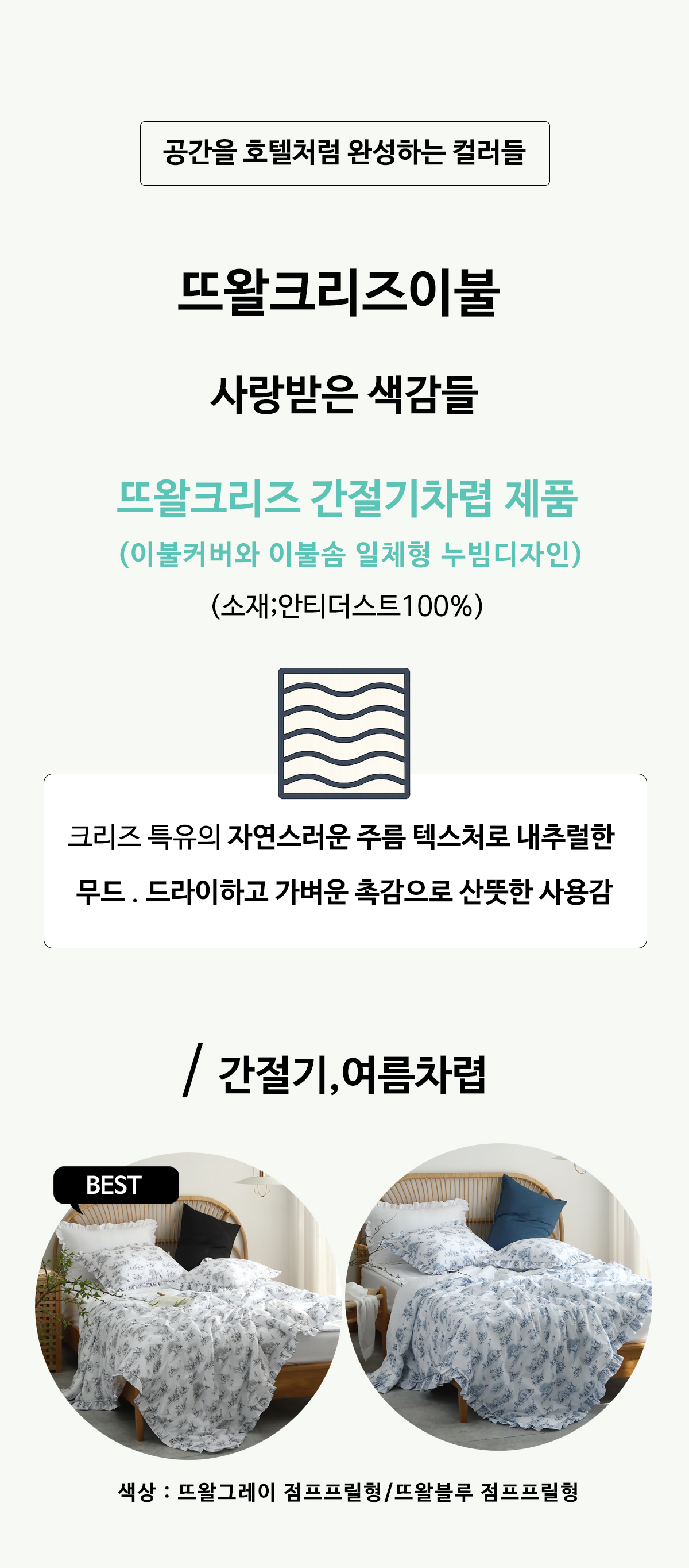 부드러운 그레이 컬러와 크리즈 화이트가 잘 어울리는 양면 차렵이불이에요 가볍고 포근해서 4~9월까지 덮기 좋아요 여름에 에어컨틀고 자니 딱이네요...세탁후에도 빠르게 건조되서 관리하기도 쉽고요 먼지날림없고 알러지케어소재라 아기와 강아지가 함께 사는 애개육아중인 집에서 사용하기 좋아요