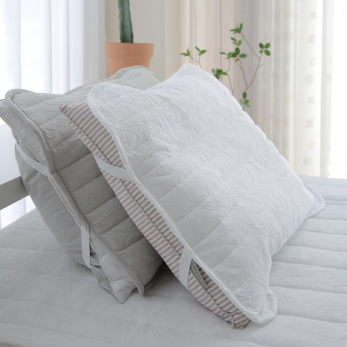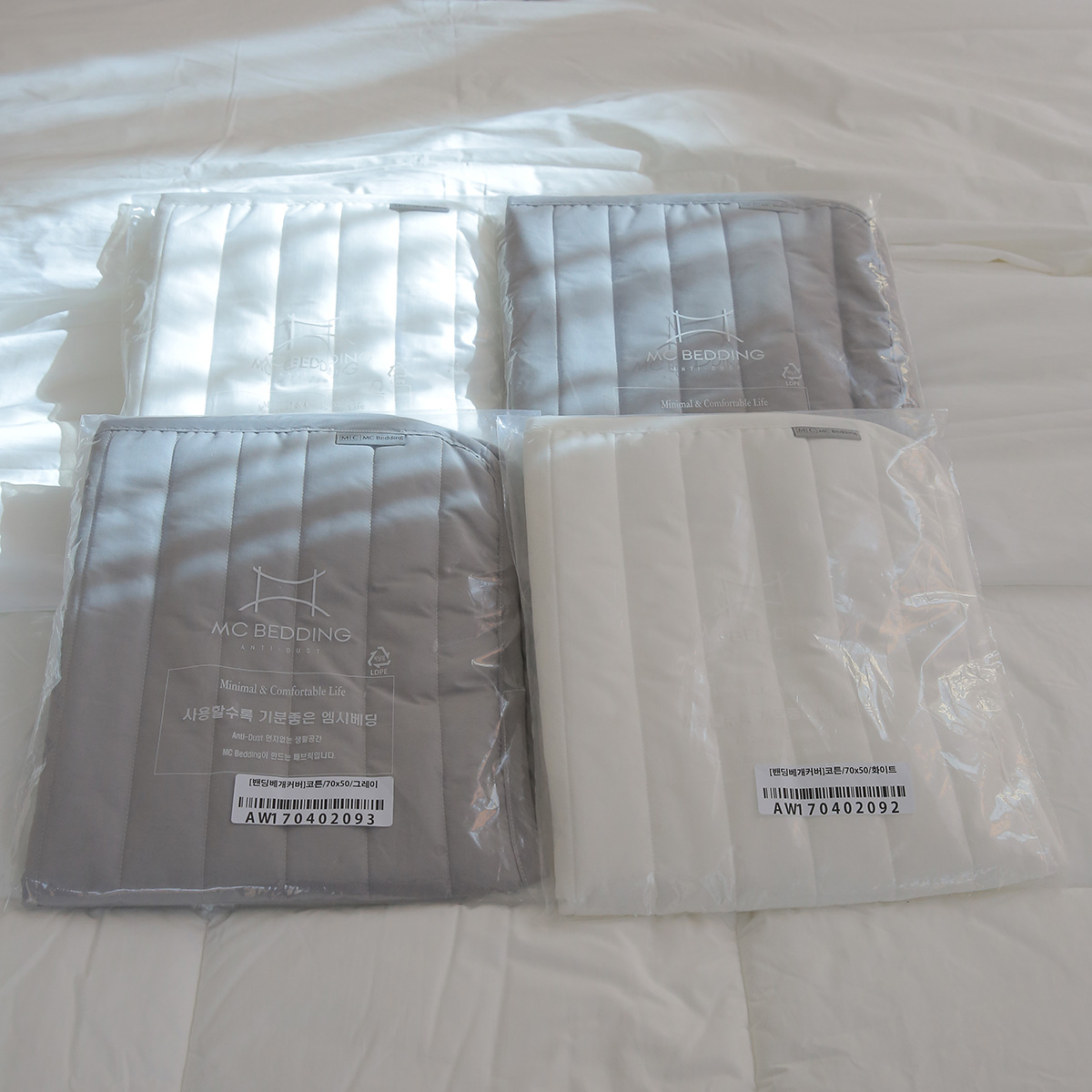 베개커버 씌우는데, 5초 벗기는데 2초,'정말 관리하기 편...해..요 !!! 여름휴가나, 여행갈때 챙겨가면 찝찝했던 베개에 얼굴 접촉할일 없어서 좋을것 같아요 침대에서 예쁘고 빛나는 엠시베딩, 베개 뒷면의 밴딩이 굵고 탄탄해서, 베개에서 벗어나는 일 없고, 안정감이 확실히 있었어요 베개 커버는 색을 맞춰도 좋지만, 남편꺼 내꺼 구분하기 좋게 그레이와 화이트 컬러로 픽했어요 :) 베개커버 촉감도 보들보들 쪼아요.. :D 더 위생적이고 편하게 사용하고 있어요🤍너무너무 만족하고있어요(ilov*****)