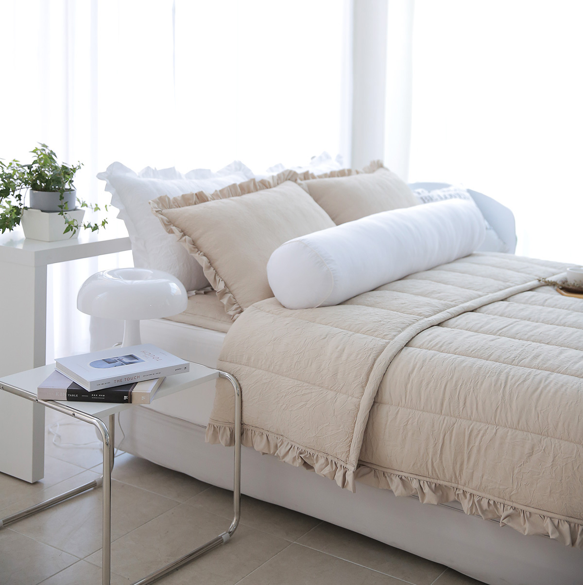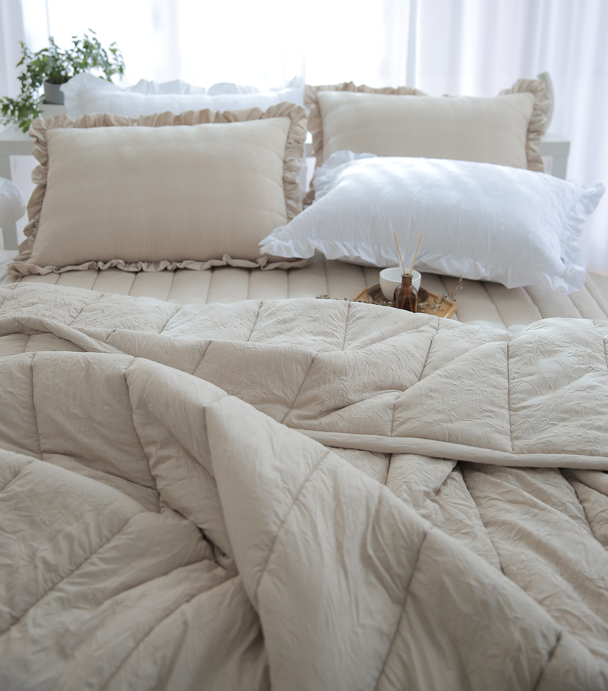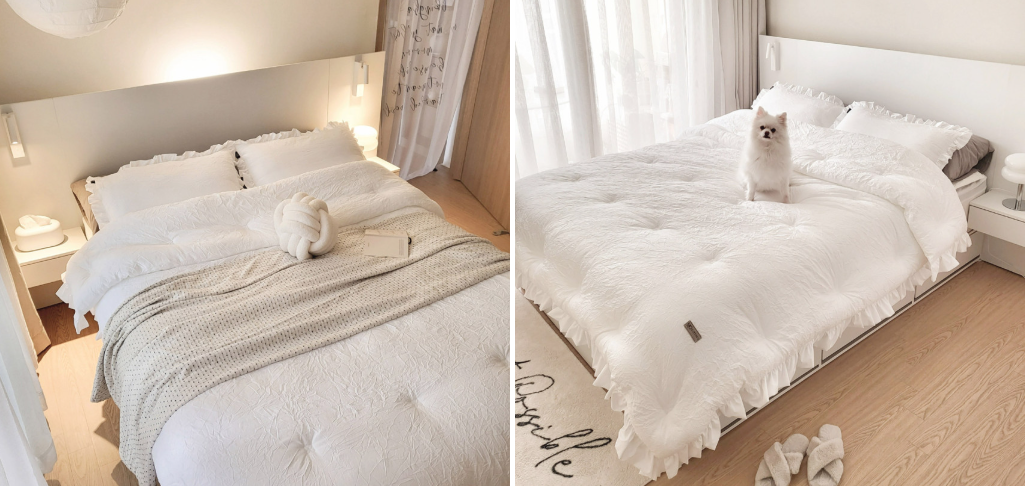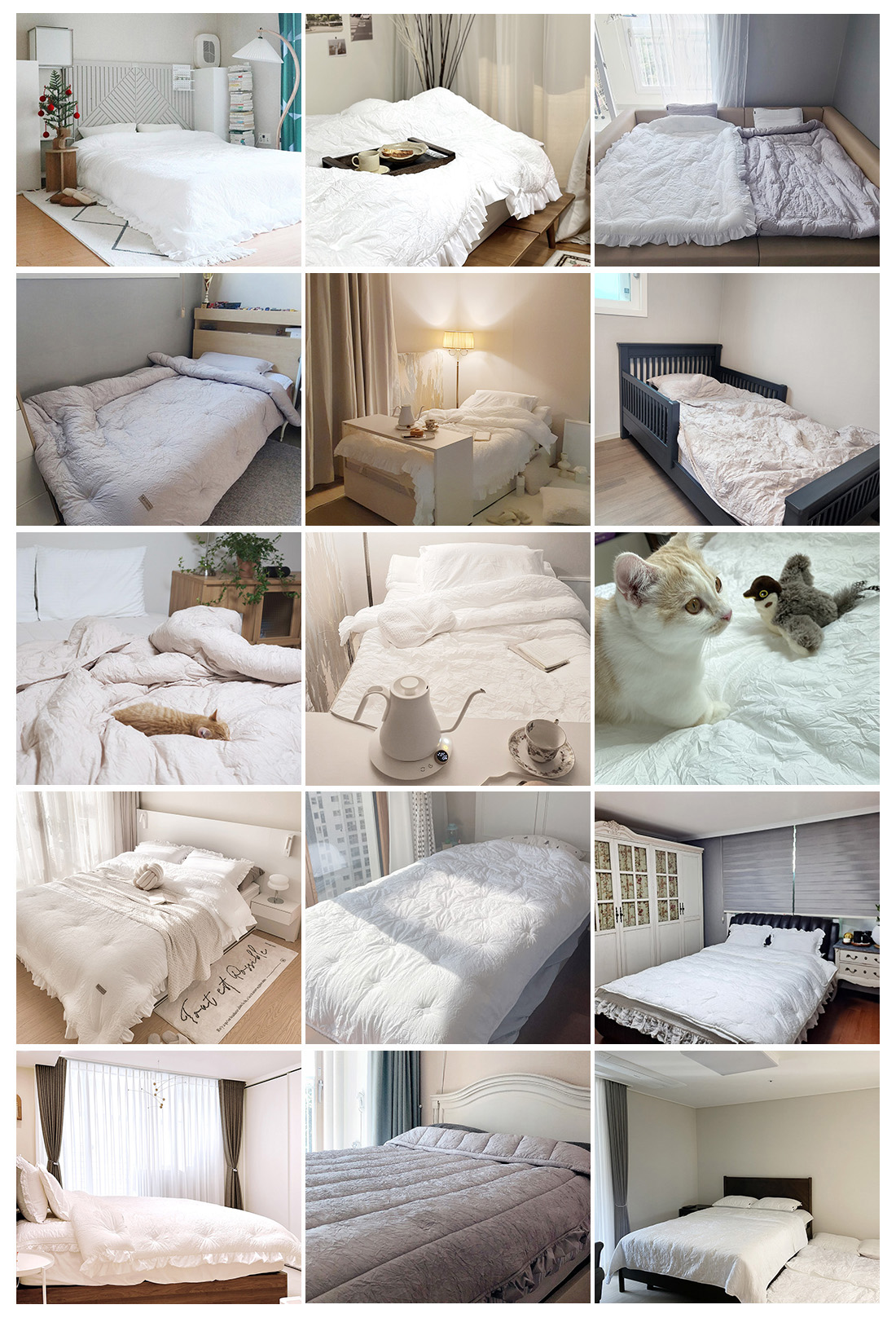 세탁하고 건조기 돌려도 펴지지 않는 예쁜주름들이 맘에 쏙🫶🏻 저는 꽃누빔 프릴형이 정말 마음에 들었는데, 실물을 받아보고 한숨 자보니 너무 기분좋은 침구더라구요 😃