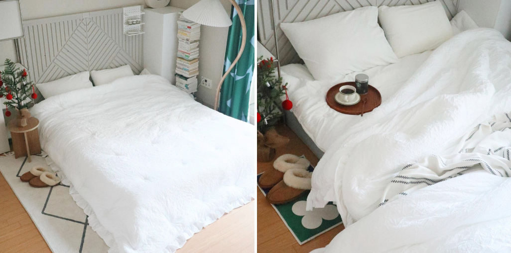 화이트 크리스마스를 기대하며, 포근하고 더 도톰한 화이트 이불로 교체했어요! 호텔 침구와 먼지 없는 러그로 유명한 #엠시베딩 제품이라 더욱 기대가 컸는데요!역시는 역시👍🏻