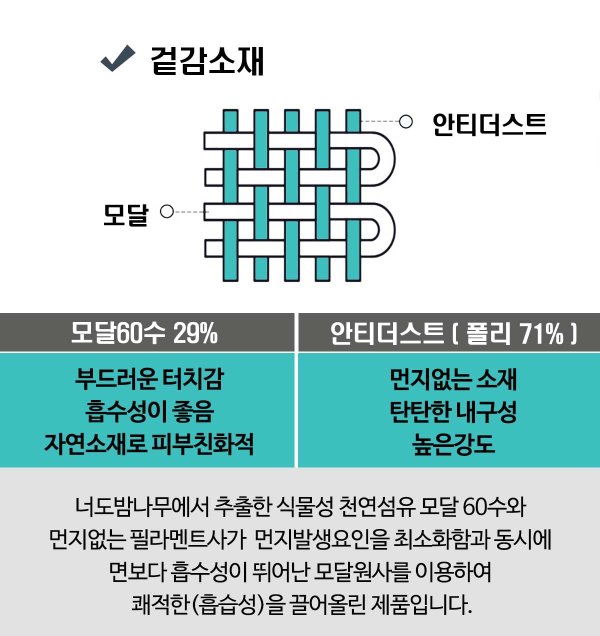 아기가 뒤집기 시작해서 침대 생활 접고 내려왔어요. 원래 손님용으로 있던 메모리폼이 있었는데 이게 보일러 바닥 열이 잘 전달이 안되더라고요 목화솜이랑 라텍스도 봤는데 .. 너무 비싸고 관리도 힘들고ㅜㅠ 그러다가 안티 더스트 요커버 발견하고 솜까지 같이 샀어요. 첨엔 나무 구름같이 포근포근해서 아가가 뒤집고 숨막힐까 걱정됐는데 일주일 지난 지금은 적당히 숨도 죽고 폭신하고 등 편안히 잘 쓰고 있어요^^ 아기랑 쓰시려면 완전 추천합니다!