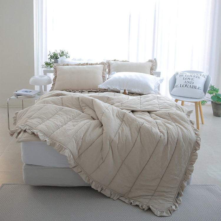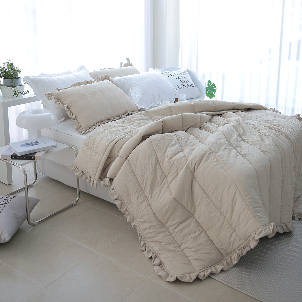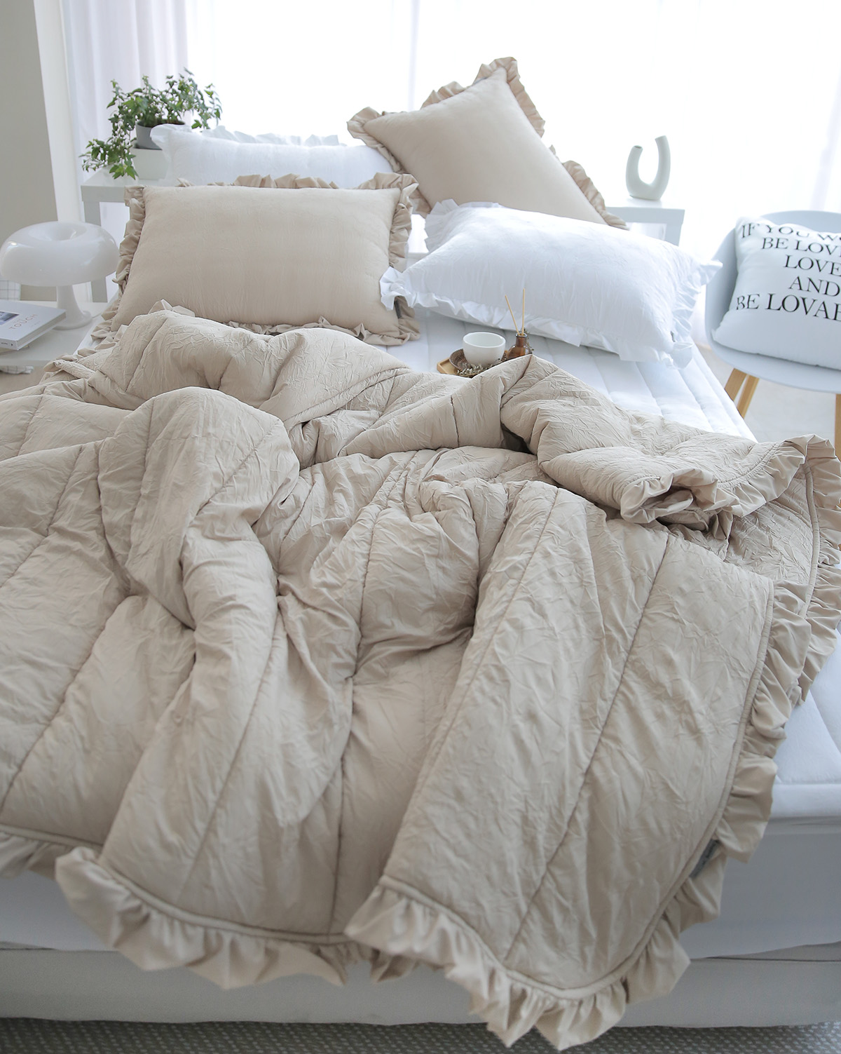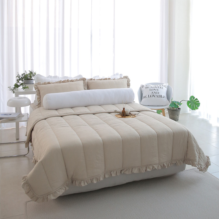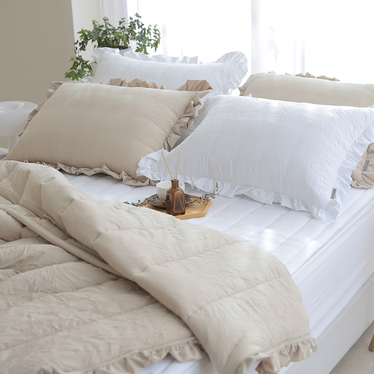 디자인이 단색이라 깔끔하고 고급스럽지만 프릴과 잔주름이 있어 밋밋하지 않고 귀엽네요. 군더더기 없는 디자인이라 기존 침구류와 섞어서 매치해도 어색함이 없습니다. 기존에 면 사틴 커버에 거위털솜 넣어 쓰고 있었는데 너무 무겁고 거위털이 날려서 불편했고 구김 때문에 이불 다림질 하느라 힘들었거든요. 이 상품은 겨울 차렵임에도 매우 가볍고 무엇보다 털은 물론이고 먼지까지 날리지 않아서 너무너무 좋아요. 주름 때문에 구김 걱정도 없고요. 받자마자 세탁했는데 겨울침구를 세탁소에 맡길 필요 없이 통째로 세탁기에 넣고 세탁할 수 있으니까 편하더라고요. 침대 위에 싹 깔고 나니 너무 예쁘고 마음에 드네요. 덕분에 침실이 화사해졌어요. 추천합니다!