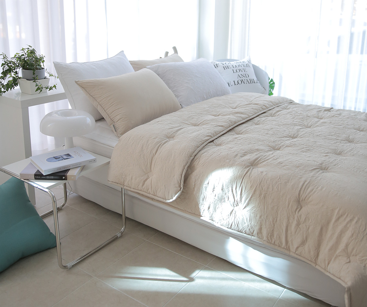 엠시베딩에서 크리즈(주름) 이불이 신제품으로 나왔어요 :-) 주름이 불규칙하게 잡혀 있는것이 너무너무 매력적이고 흔하지 않아서 눈길이 갔답니다 😮 세탁하고 건조기 돌려도 펴지지않는 예쁜주름들이 맘에 쏙🫶🏻 저는 꽃누빔 프릴형이 정말 마음에 들었는데, 실물을 받아보고 한숨 자보니 너무 기분좋은 침구더라구요 😃 은은하게 바스락 거리는 느낌과 9온스로 푹신함이 더해져, 잠도 잘 오고 온몸이 구름속에 있는 기분이었어요 ㅎㅎ 겨울엔 역시 폭닥한 두께가 좋죠 (심지어 가벼워요) 먼지가 거의 없어서 아기와 반려동물, 어르신들도 호흡기 문제 없이 안전한 이불이예요 :-) 😊 사계절용으로도 유용한 이불세트로 추천합니다 🌿🫶🏻