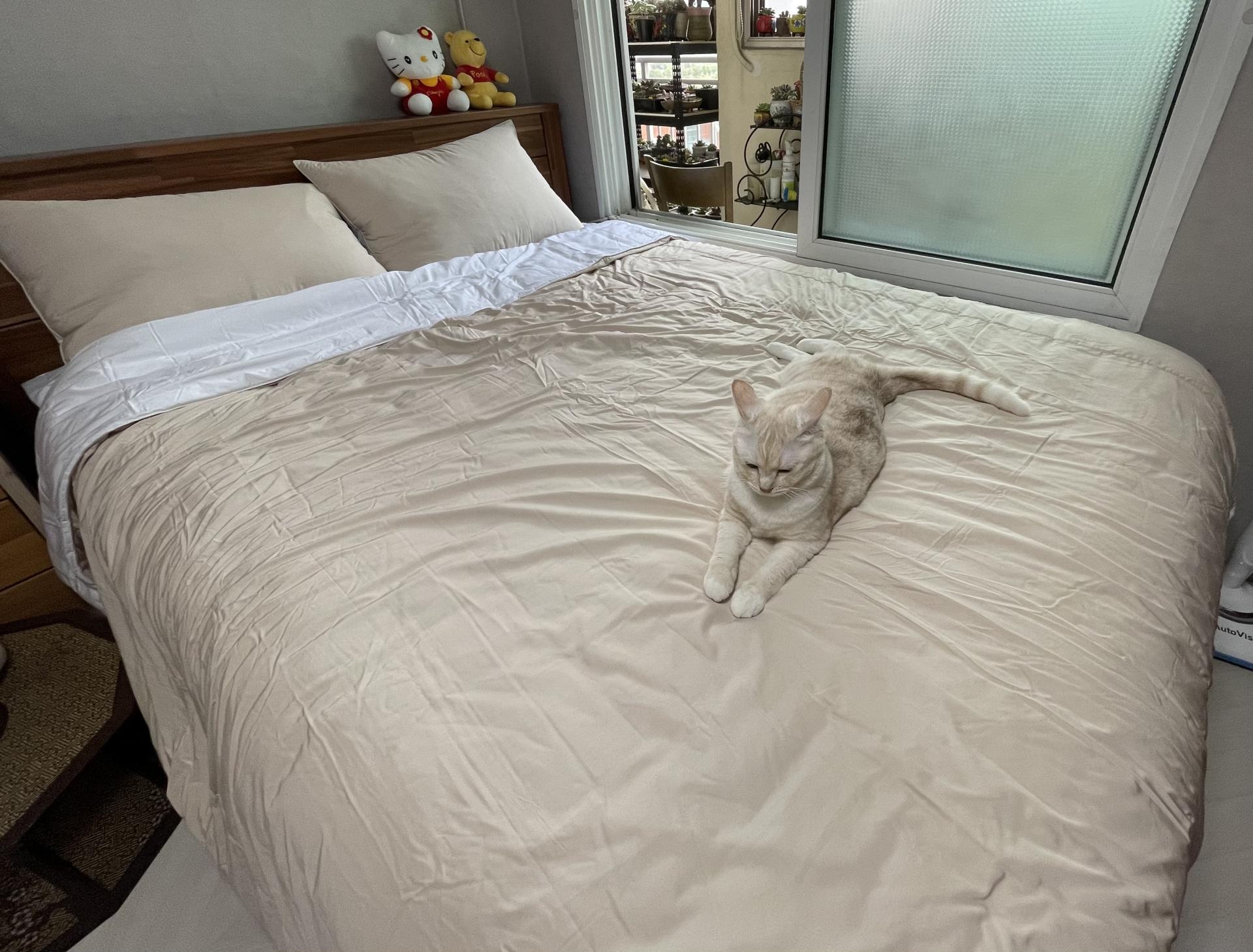 모달침구라 정말 부들부들하고 누우면 그냥 기분이 좋아요 맨날 꿀잠잡니당 보다시피 저희집엔 냥님이 있어서 침구는 무조건 알러지방지침구여야해요ㅠㅠ 그래야 저렇게 뒹굴거려도 돌돌이나 툭툭 털면 털이 털리거든요! 엠시베딩침구는 재구매인거라 완전 걱정없이 믿고 주문할수있었어요!