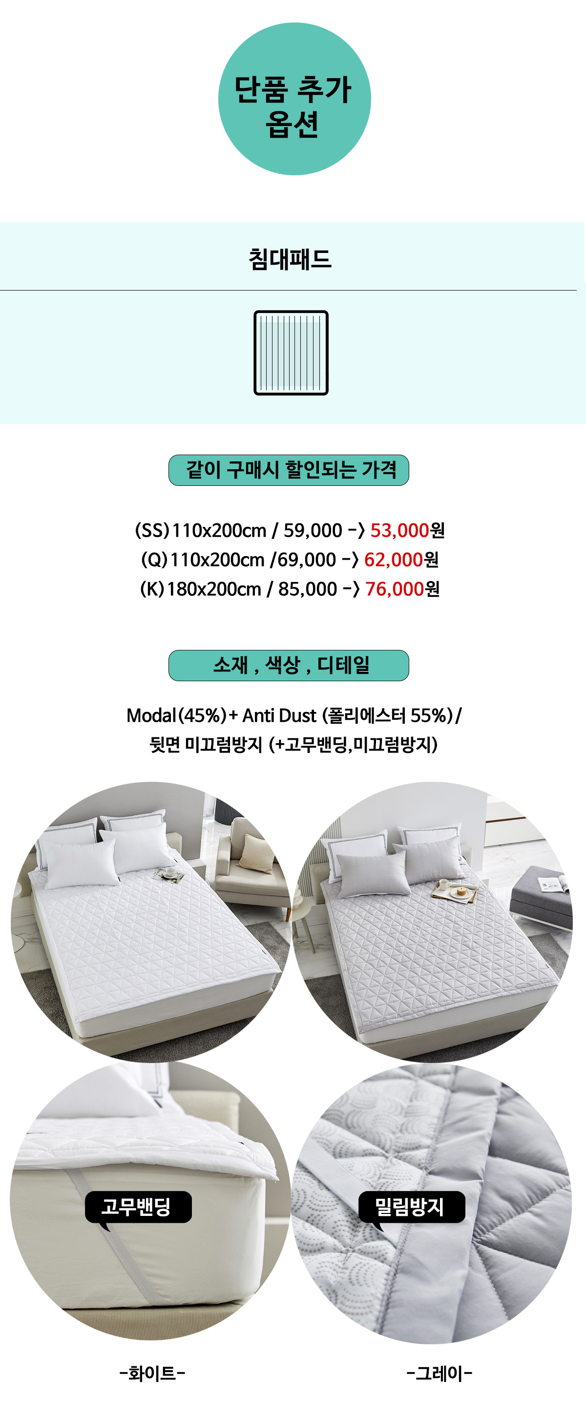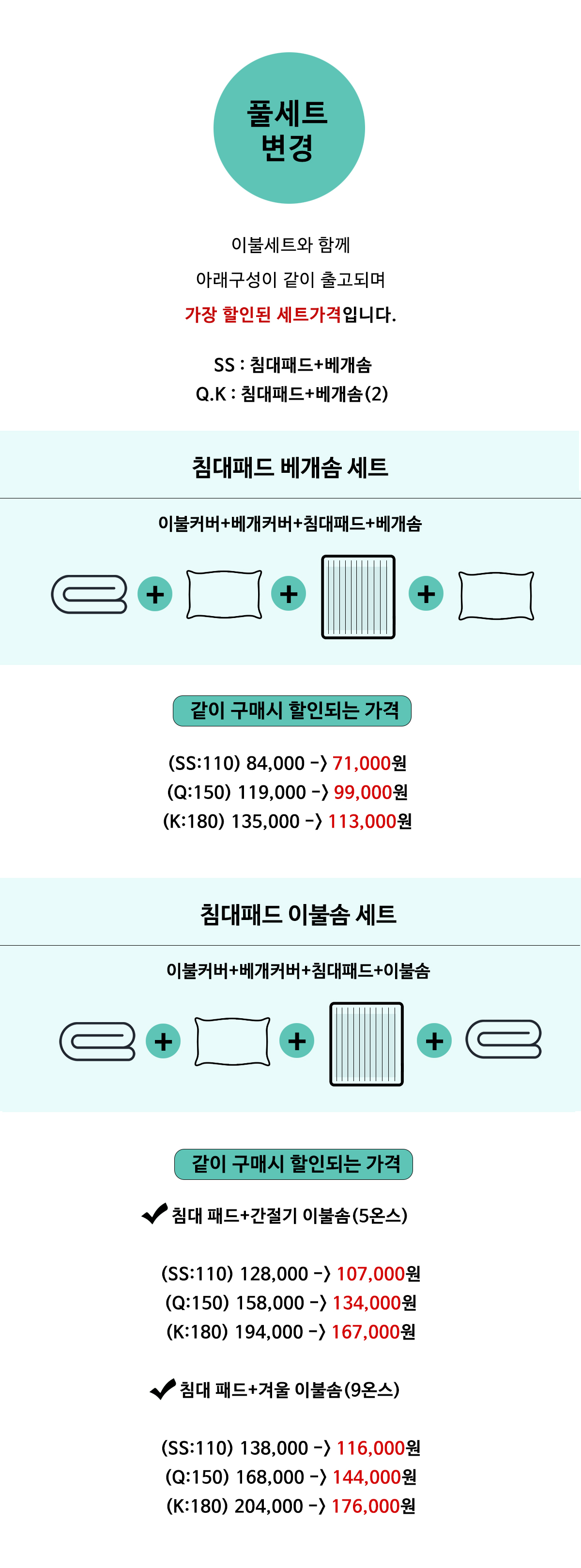 | 풀세트로 구매 원하시면 추가옵션에서 풀세트로 변경선택 ※가장 많이 할인 받는 옵션※ ☞ 풀세트 옵션별 출고구성 [ 침대패드베개솜 세트 ] 이불커버+베개커버 +침대패드+베개솜 [ 침대패드이불솜 세트 ] 이불커버+베개커버 +침대패드+이불솜 |