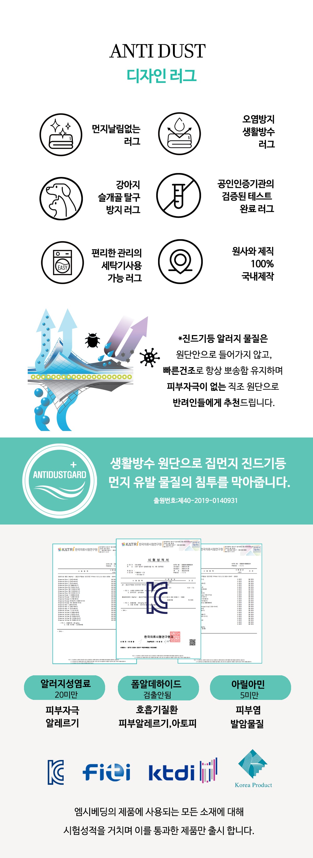먼지알레르기가 있는 저는 다른 카펫은 잘 사용하지 못해요.그런데 엠시베딩 반다나러그는 파일이 없는 러그라서 먼지가 없어 사용하기 좋더라고요. 거기에 발수처리가 되어 있어서 신기하게도 주스를 흘려도 러그속으로 스며들지 않아요!! 그리고 무엇보다 디자인이 너무 예쁘고 고급스럽답니다. 아이있는 집, 반려동물 있는집에서도 안심하고 청결하게 사용할 수 있어요!!!