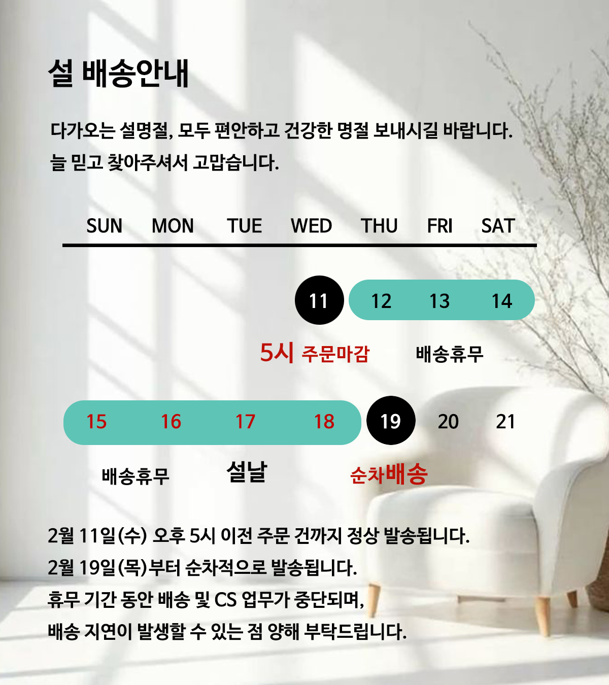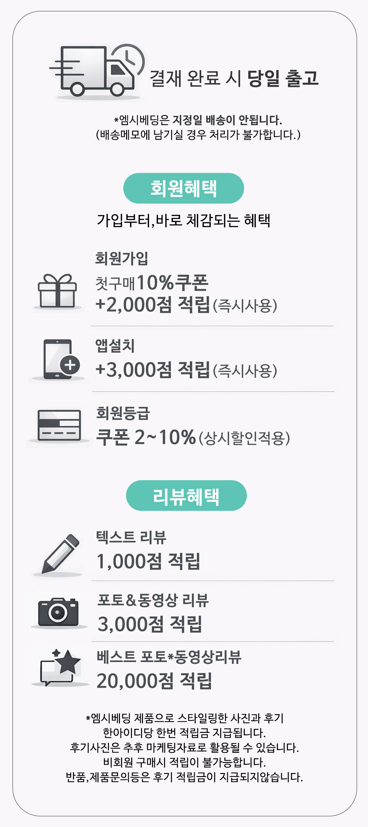 | 지정일배송 | 지정일배송은 불가합니다.(배송메모에 남기실경우 확인및 처리가 불가합니다.) |